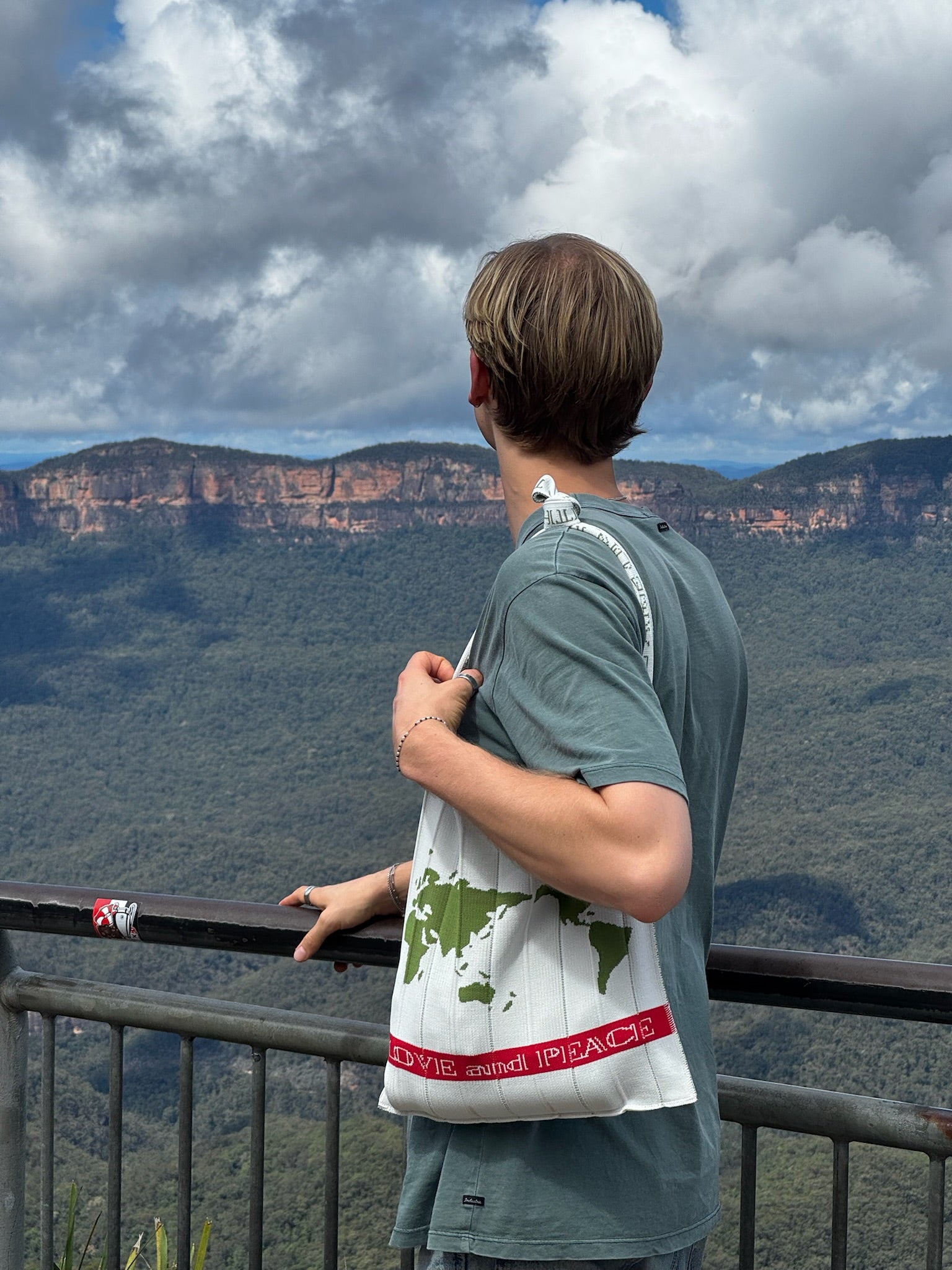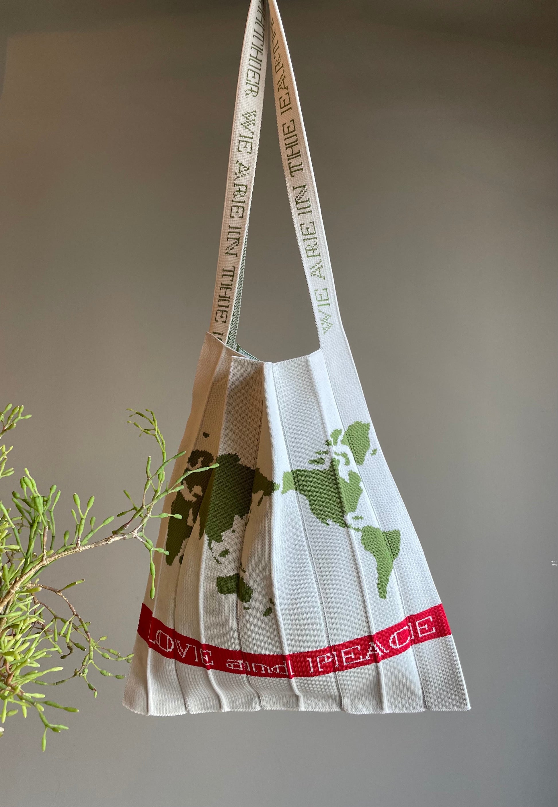 A piece featuring a knitted world map design.