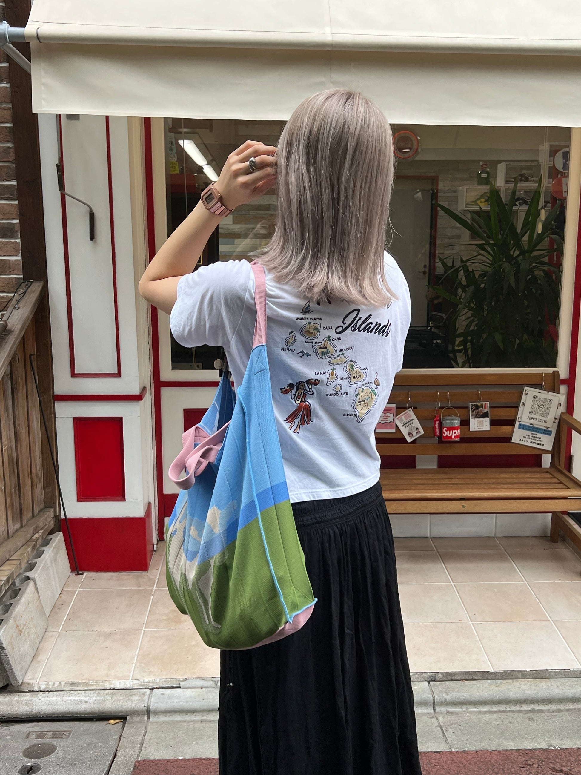 リサイクルされたペットボトルの糸から、日本の自社工場を中心に国内で生産しています。たくさんの荷物を入れていただくことを想定してつくっているため、程よい伸縮性はありますが伸びきって元に戻らなくなることはほとんどありません。汚れたり、たくさん使ったあとはおうちでお洗濯していただくことで、綺麗に長くご使用頂けます。