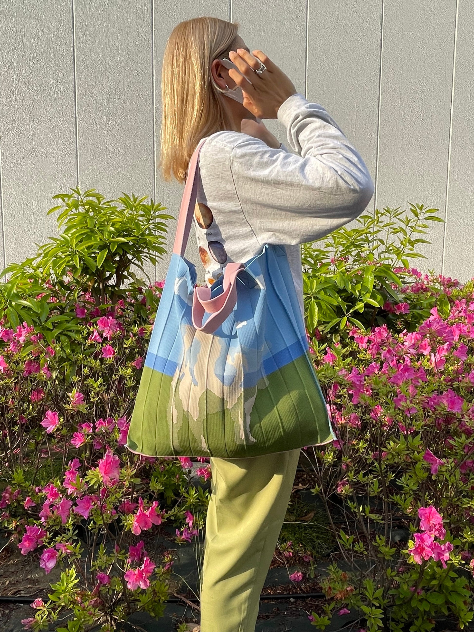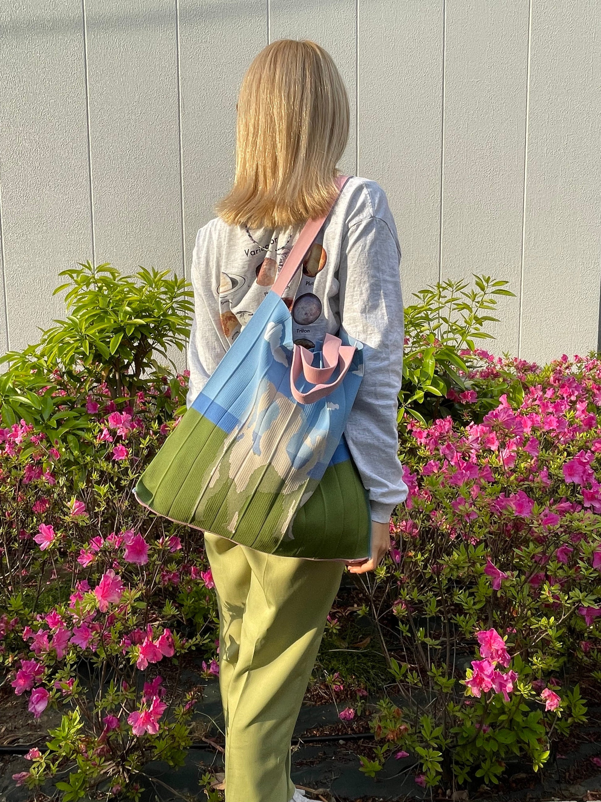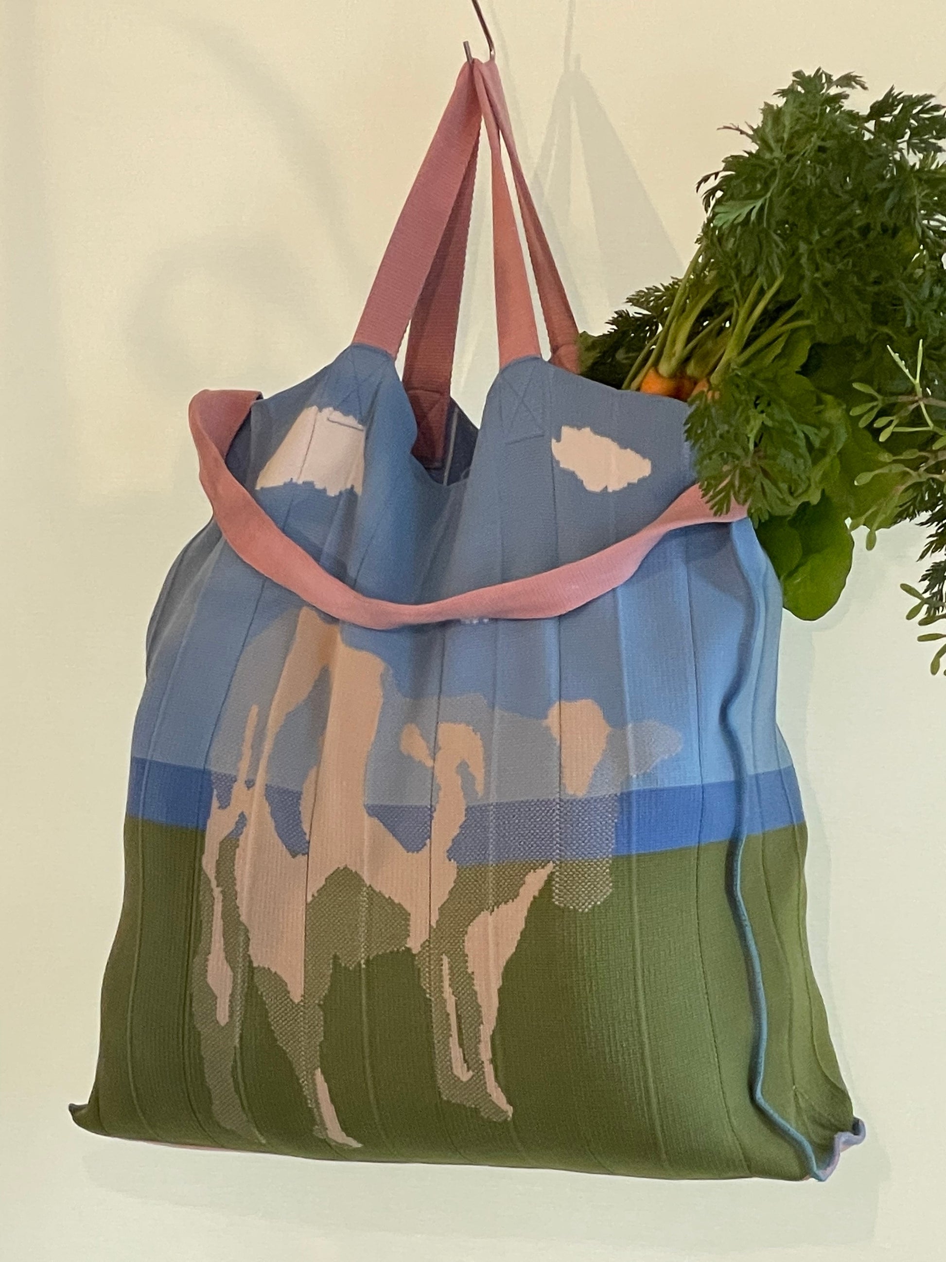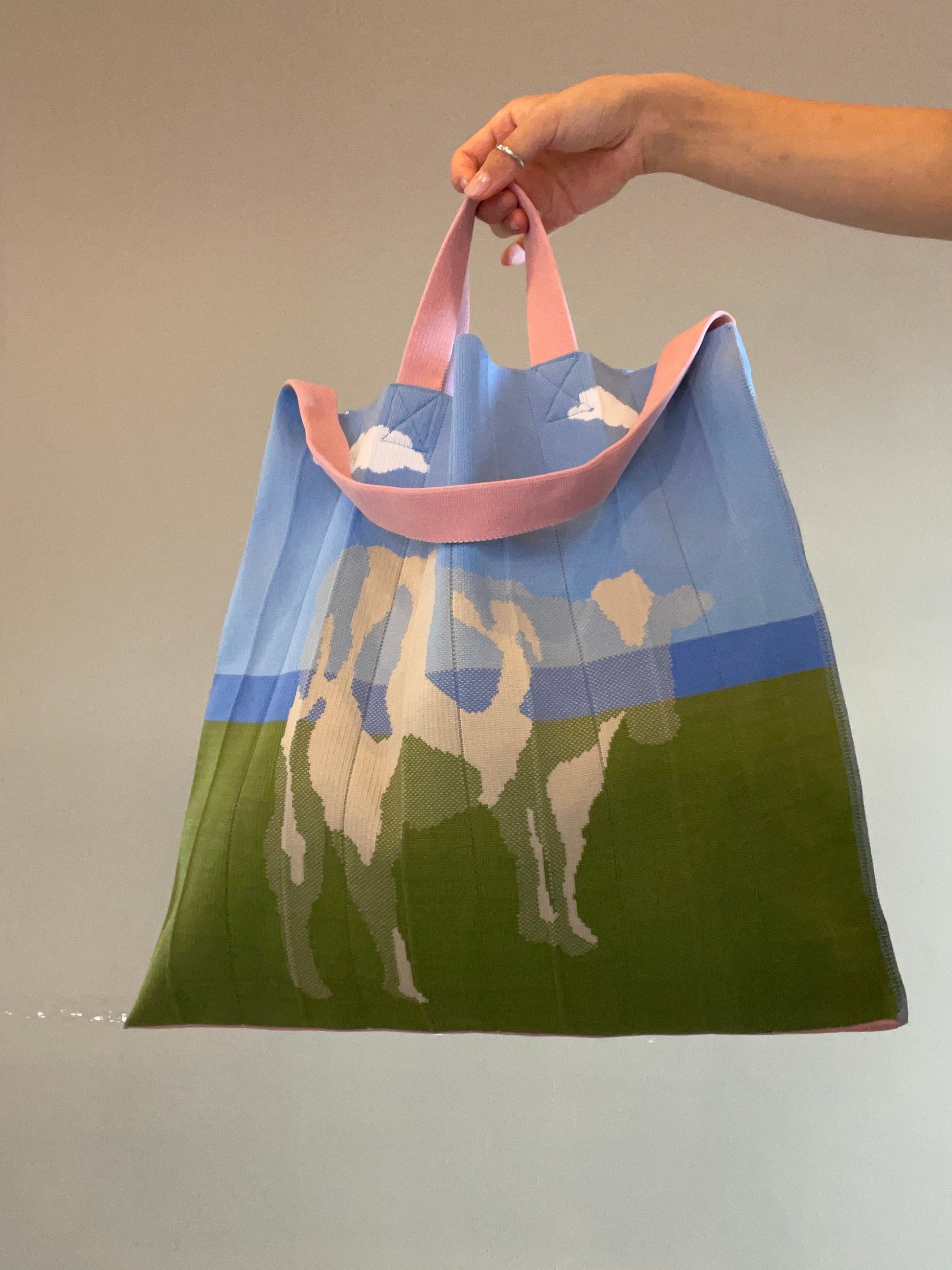 草原に牛のシルエットがデザインされ、ショルダーのピンクが映える作品。